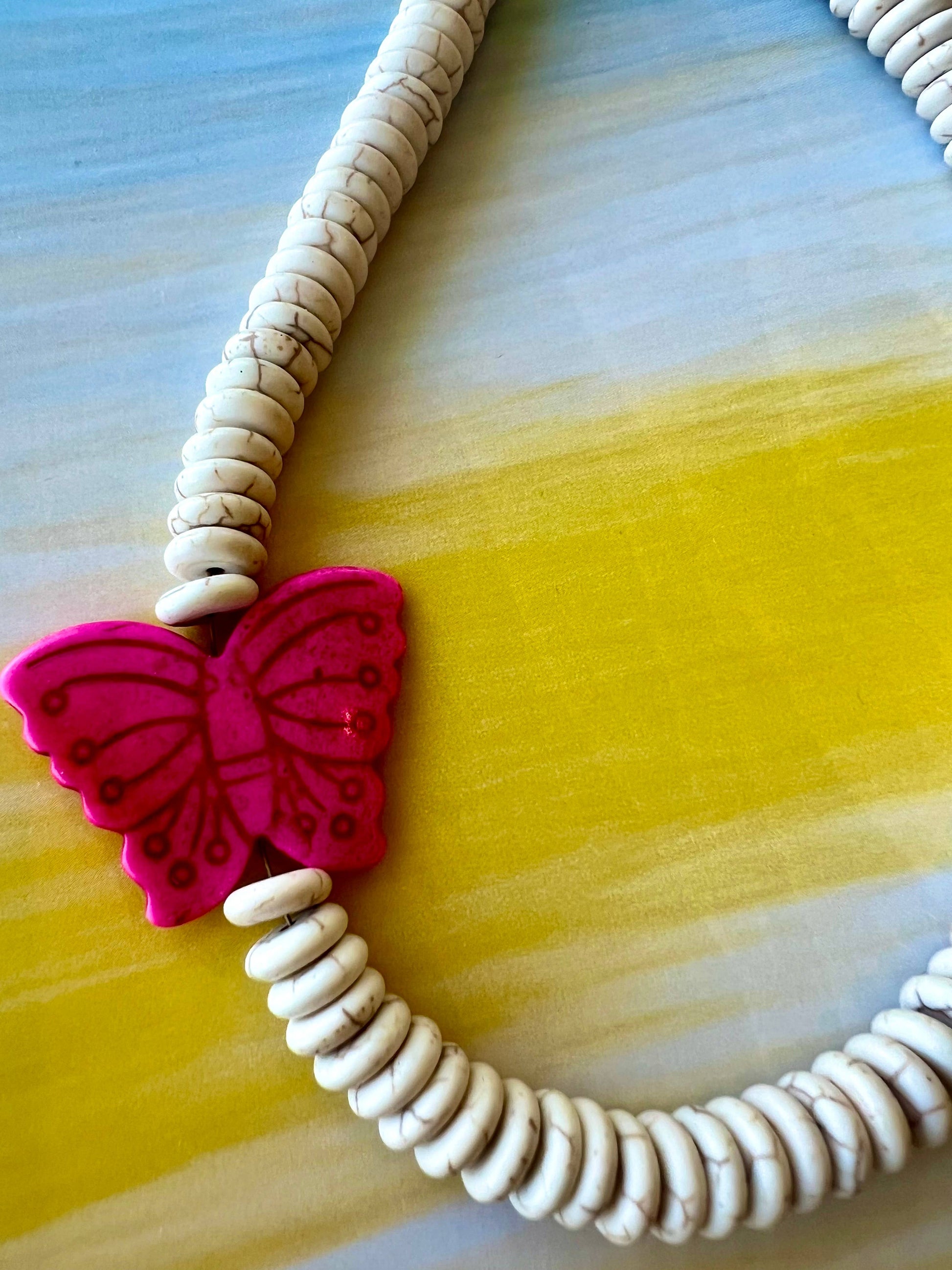 Howlite bead with butterfly accent. A perfect pop of pink for any outfit. Necklace length is adjustable 15-17." The perfect spring and summer accessory.