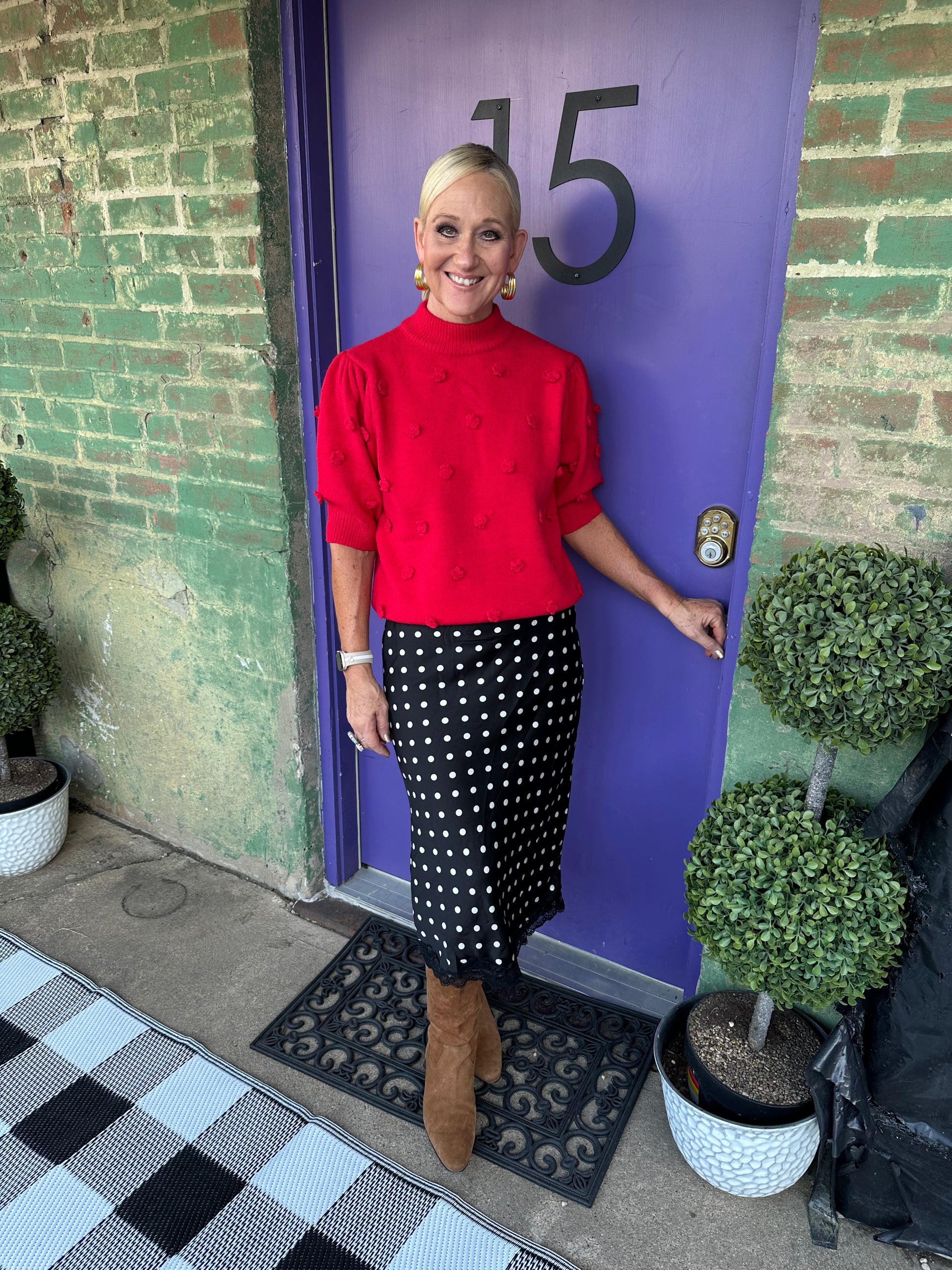 + 3D floral knit short sleeve sweater + Ribbed mock neck + Short puff sleeves with ribbed cuffs + Relaxed fit semi-cropped pullover + Ribbed neckline, cuffs, and hem