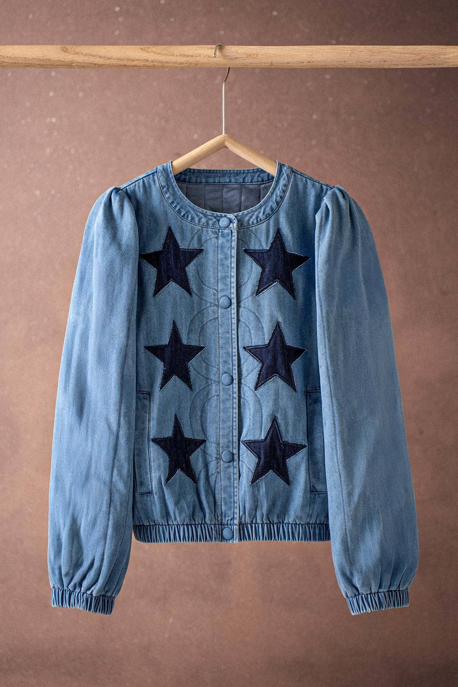 This statement denim jacket features bold star embroidery throughout, puff sleeves, and a snap button front for a playful twist on classic women’s clothing. The gathered cuffs and hem add shape, making it perfect for spring